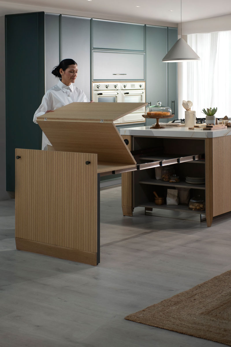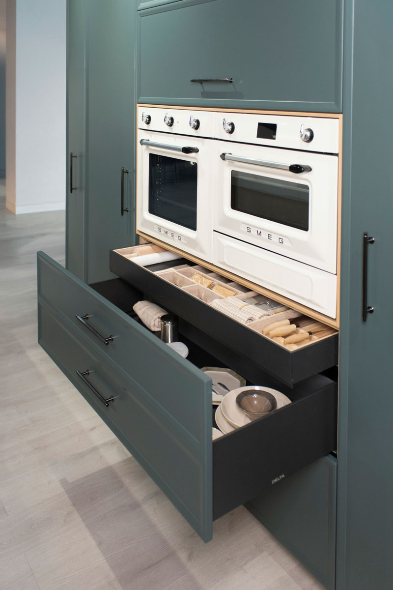 Puertas lacadas Vermont plegables con armazón en rovere claro, electrodomésticos retro y frentes en verde mate para un espacio funcional y con estilo.