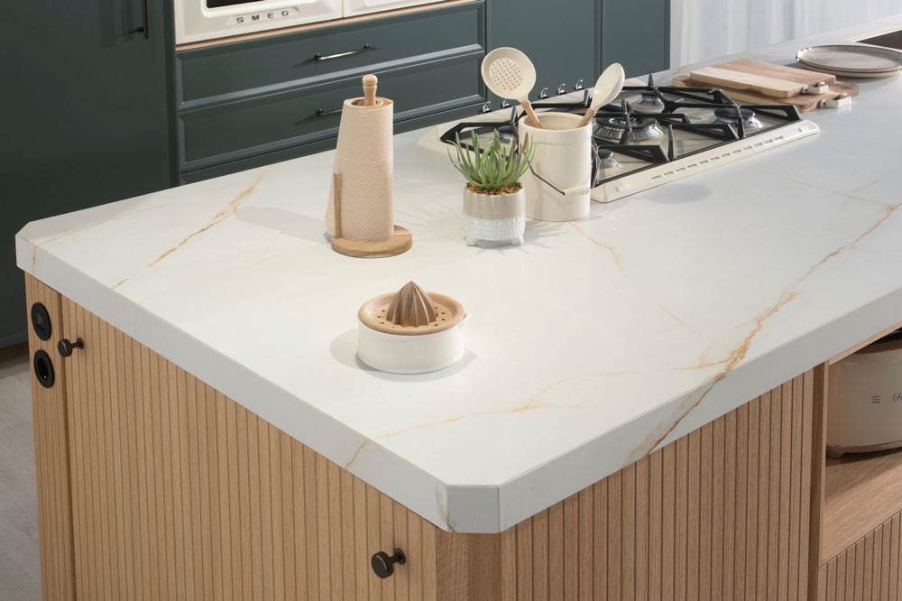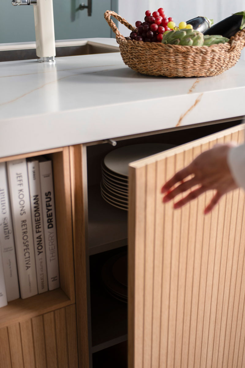 La madera clara del mobiliario, con puertas en acabado roble y regleta biselada integrada, se combina con el verde mate de las columnas, creando una atmósfera serena y equilibrada.