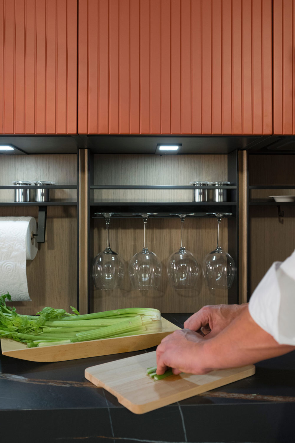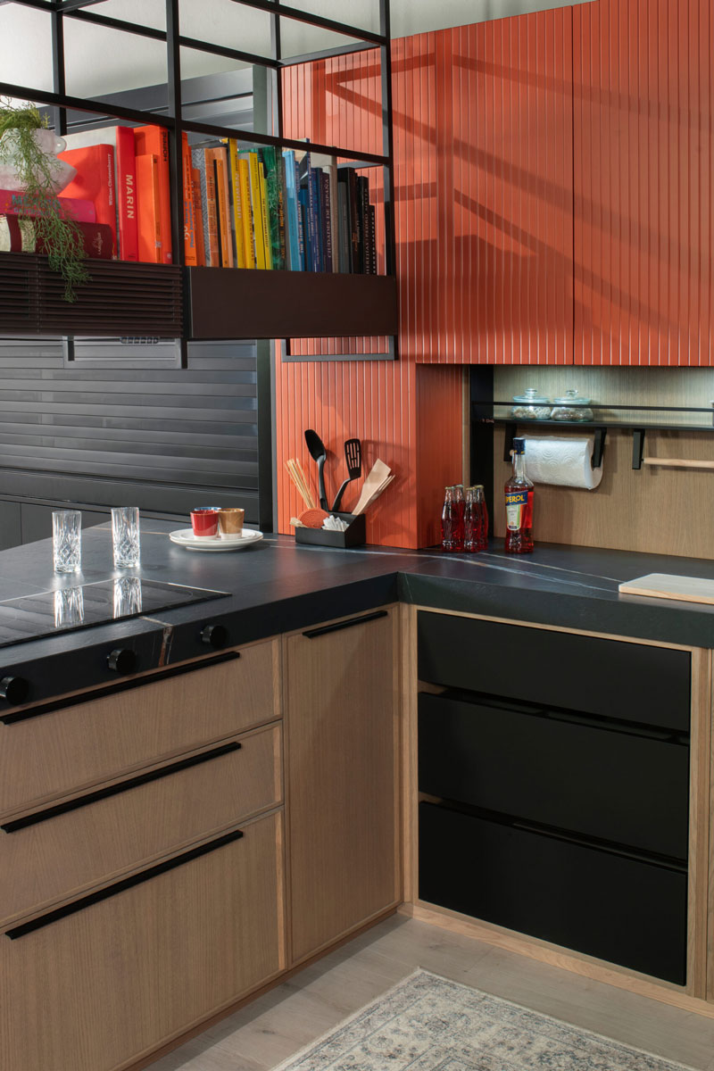 La belleza de esta cocina no solo está en lo que muestra, sino en todo lo que sabe esconder. La fuerza del color Rojo Gales se equilibra con la calidez de la madera y el negro de las superficies de trabajo, creando un ambiente con mucha personalidad y estilo propio.