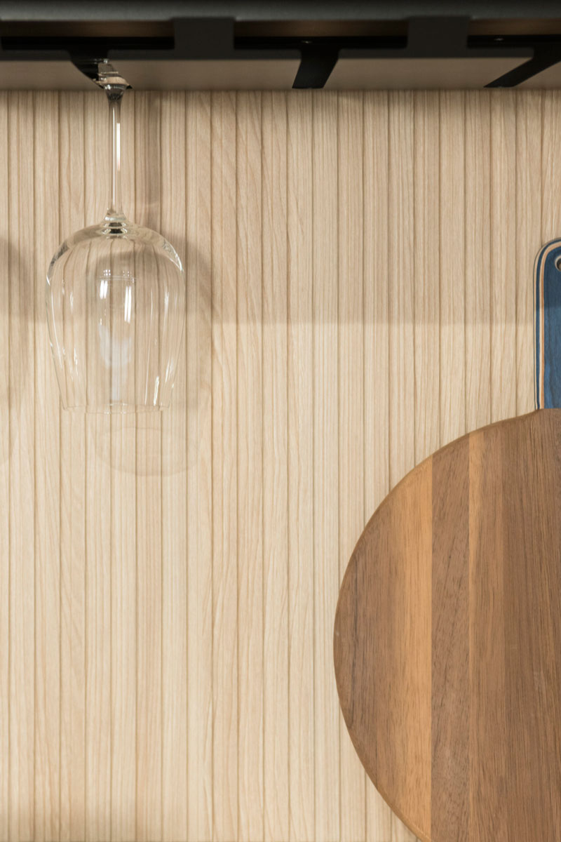 Vitrinas con cristal entablillado en negro y estantes de cristal con luz en la parte posterior, que combinan ligereza visual y diseño funcional en perfecta sintonía con el panelado de madera.